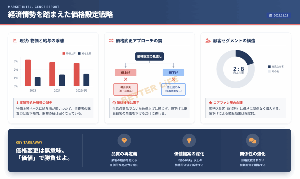 というわけで、結論としては何もしないのが一番ですし、売上減に悩むなら、価格以外のところに見直しを図ることを推奨します。