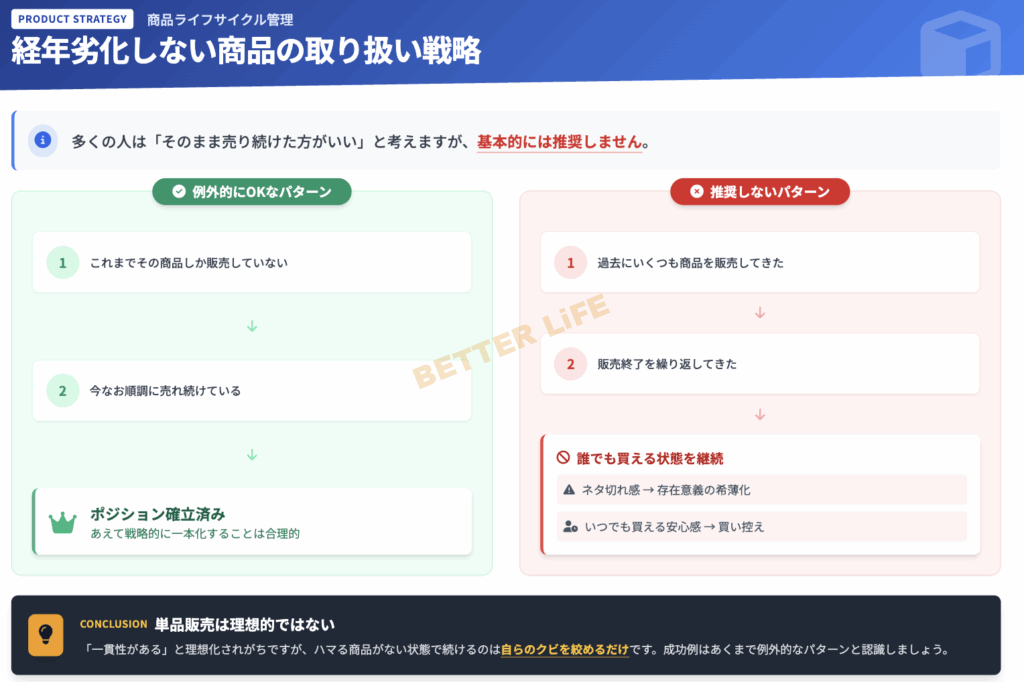 経年劣化しない商品は、そのまま売り続けた方がいいと考える人が多いです。