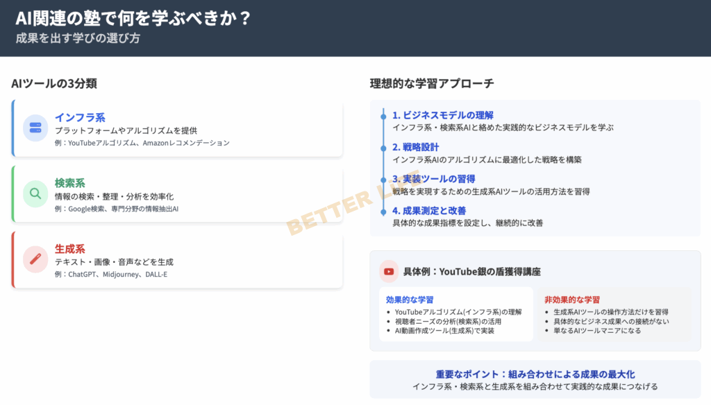 というわけで、教材や塾で学ぶ際は、生成系AIツールの使い方を学ぶだけではダメですし、一方でインフラ系や検索系について学んだところで、それを具現化する方法を身につけることができなければ、絵に描いた餅でしかありません。