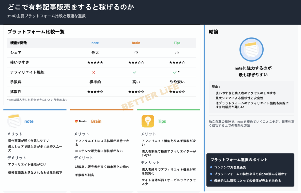 コンテンツ販売者と相性が良いのは、note、Brain、Tipsの3つです。