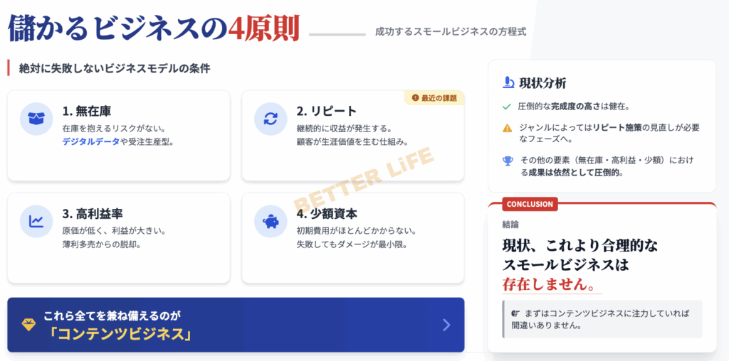 儲かるビジネスの4原則とは、無在庫、リピート、高利益率、少額資本で実践可能であることです。