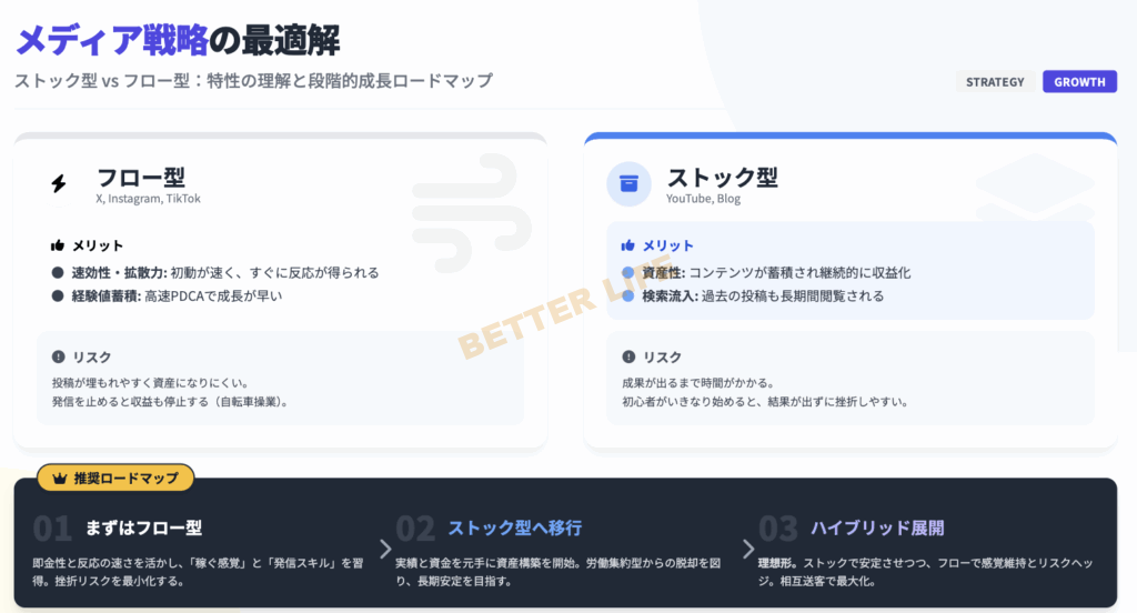 そうやって、経験値とお金を稼いだ上で、満を持してストック型に取り組んでいくというのがベターです。