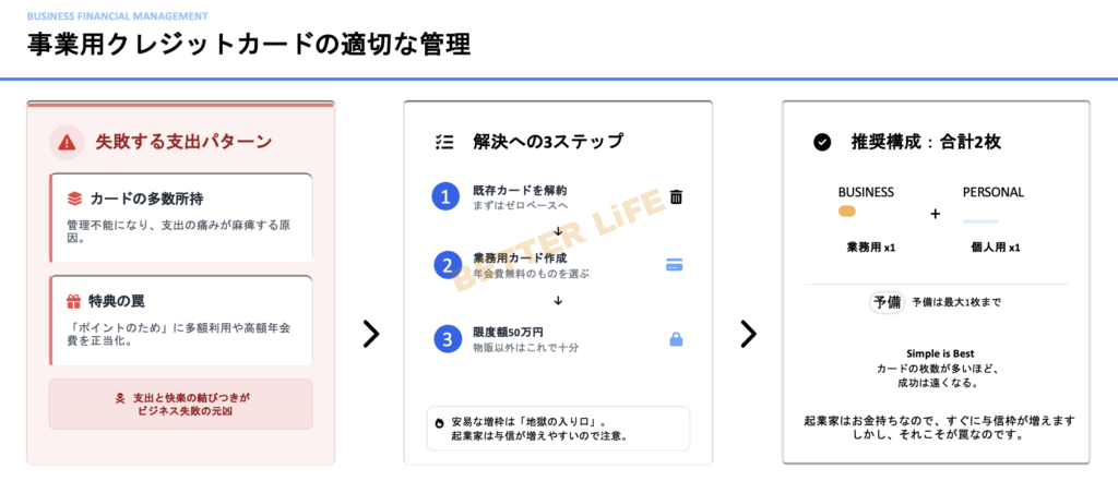 なお、クレジットカードは業務用と個人用が1枚ずつあれば十分です。