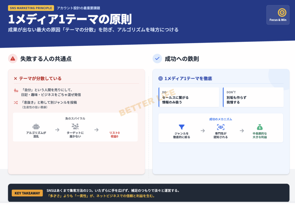 原則として、1メディア、1テーマの発信を徹底する必要があります。