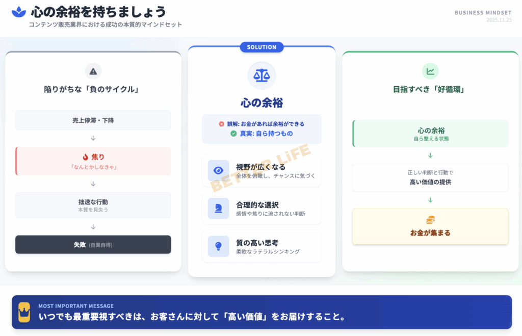 心の余裕は、お金を稼げば自然発生すると勘違いしている人もいますが、それは大きな間違いです。