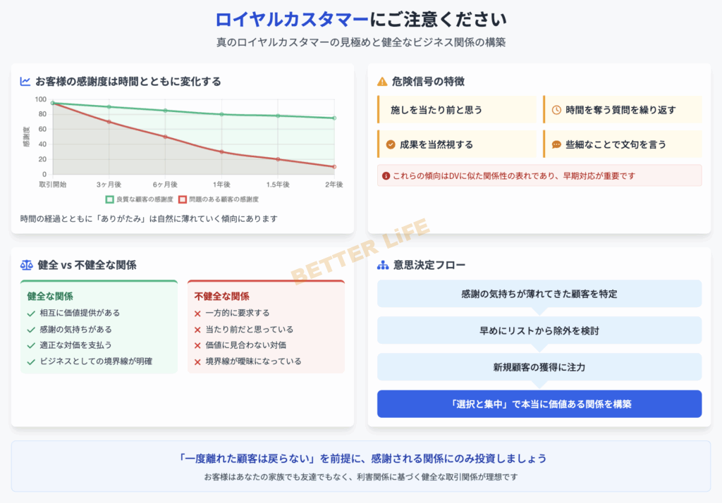 だからこそ、感謝の気持ちが薄れてきたお客さんとは、きっぱりと関係を断ち切る決断も必要になってきます。