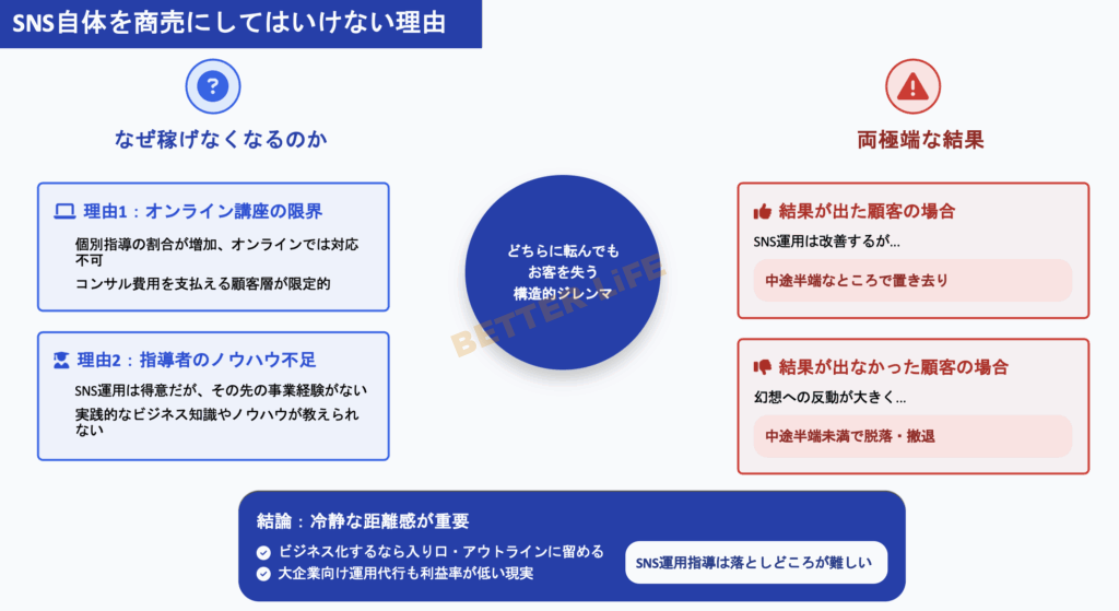 そしてもう1つの理由が、指導者自身が、SNS運用こそ得意ですが、その先の事業経験がないので、ノウハウがなく教えることができないという事情もあります。
