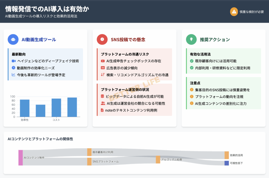 既存のお客さんに見せるだけならいいのですが、集客目的で、SNS投稿に利用する際、AIで生成された動画が、今後冷遇される懸念があるからです。