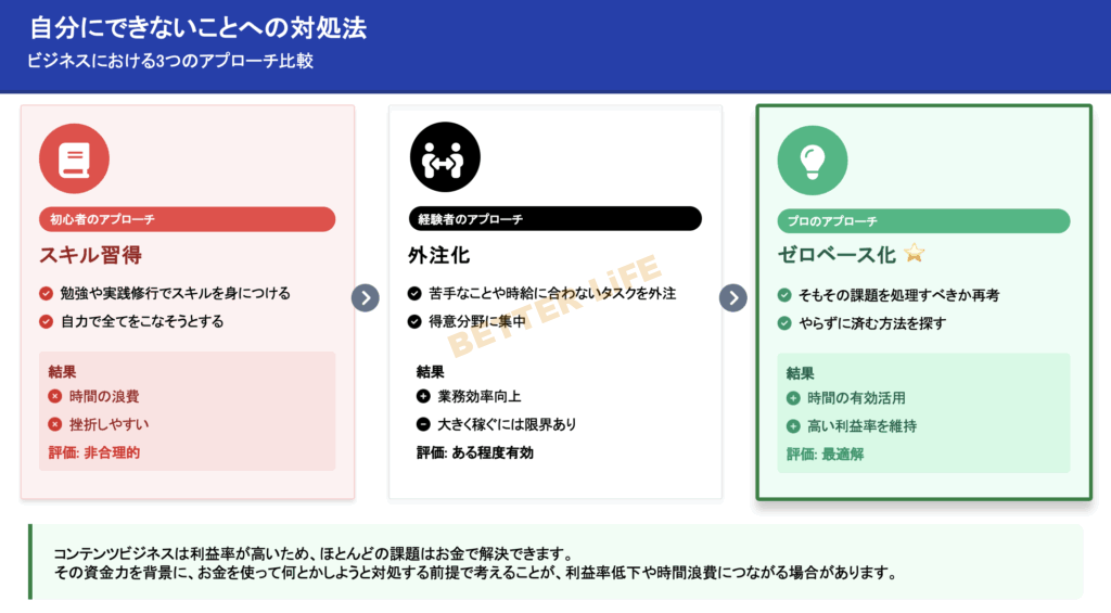 以上を踏まえて、自分ができないことに直面した際の理想的な対処法としては、ゼロベース化をするということです。