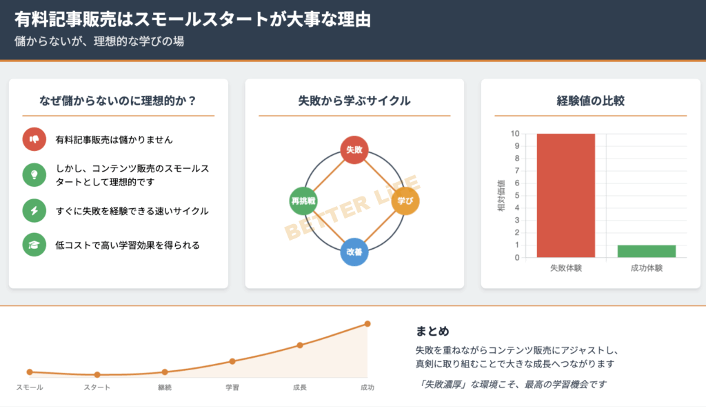 つまり、儲からないどころか、売れないことの多い有料記事に取り組むことは、失敗の経験値を速いサイクルで経験できるという点で、この上ない学びの機会になるのです。