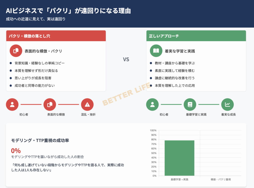 ともすれば、モデリングやTTPというアプローチは、自分が成功者と同等以上の能力を持っているという、思い上がりのようなものでしかありません。
