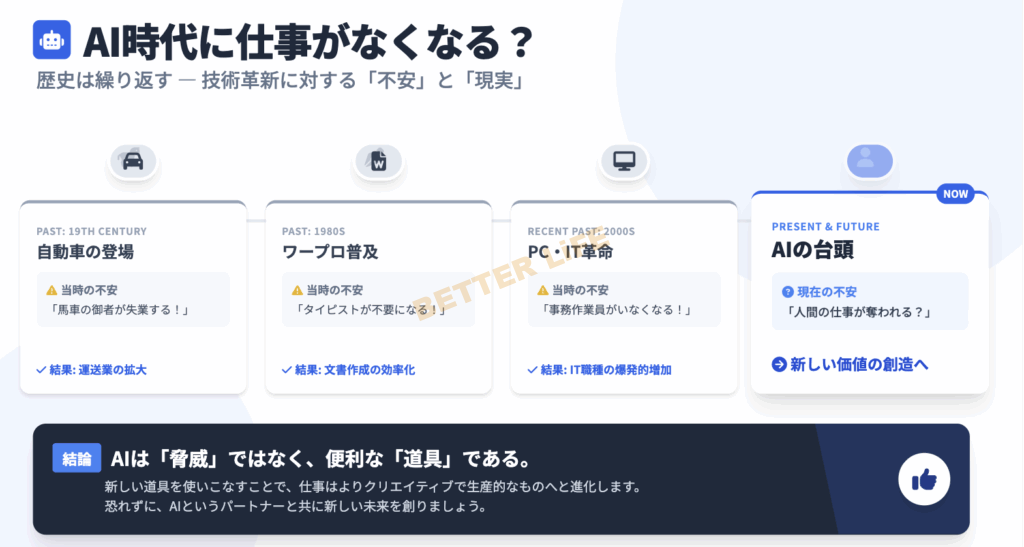 たぶん、自動車が発明されたとき、馬車の運転手は、同じような不安を抱いたことでしょう。