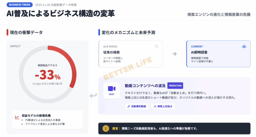 2025年11月28日付の日経新聞によると、Googleが、AIまとめを導入して以降の2年で、実に33%もの検索経由アクセスが減少したと報告がありました。