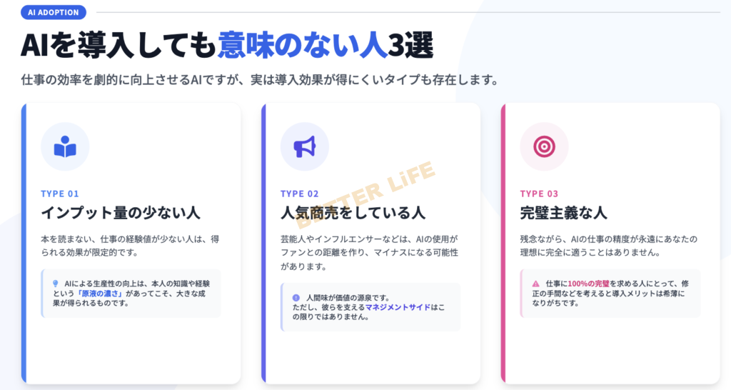 したがって、仕事に完璧を求める人には、導入メリットは希薄です。