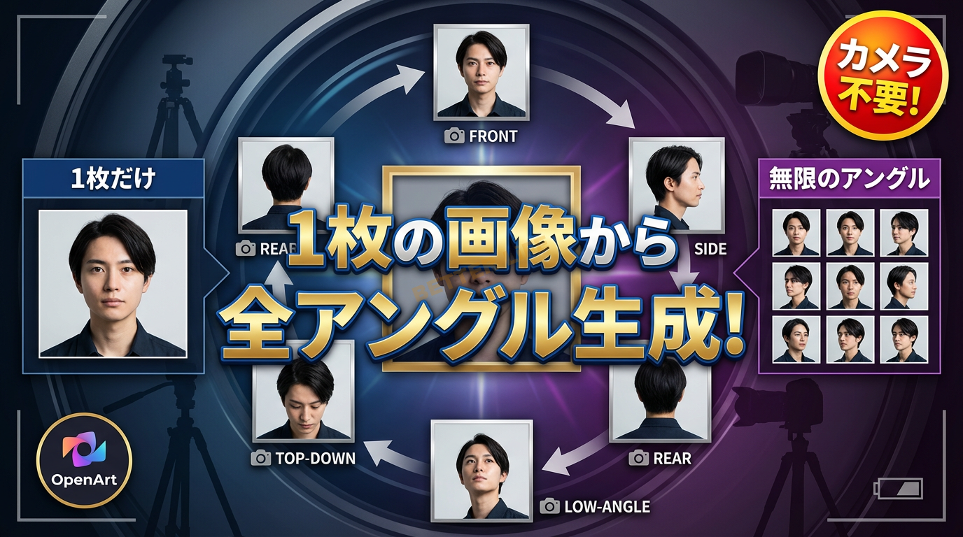 本記事では、OpenArt が新たに実装した革命的機能「Camera Angle Control(カメラアングル制御)」を使って、単一の画像から正面、背面、俯瞰、接写など、あらゆる視点の映像を生成し、それを動画として完成させる具体的なワークフローを、5つの章にわたって徹底解説します。撮影機材不要、カメラクルー不要――必要なのは、あなたのアイデアと1枚の画像だけです。