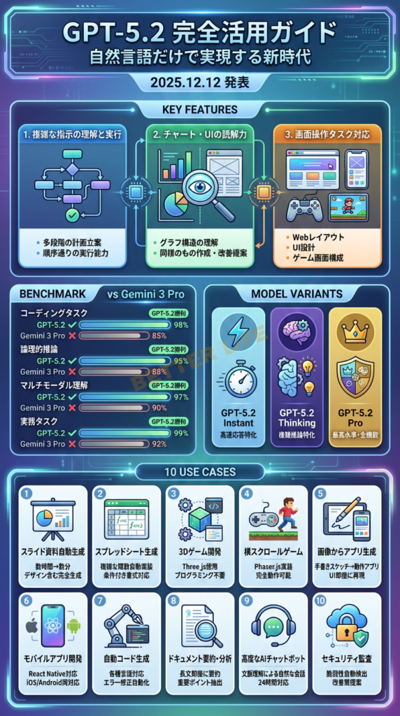 本記事では、GPT-5.2の概要から、今すぐ使える10の実践的な活用事例まで、具体的に解説します。ビジネスパーソン、クリエイター、開発者、そしてAI初心者まで、すべての方に役立つ情報が満載です。