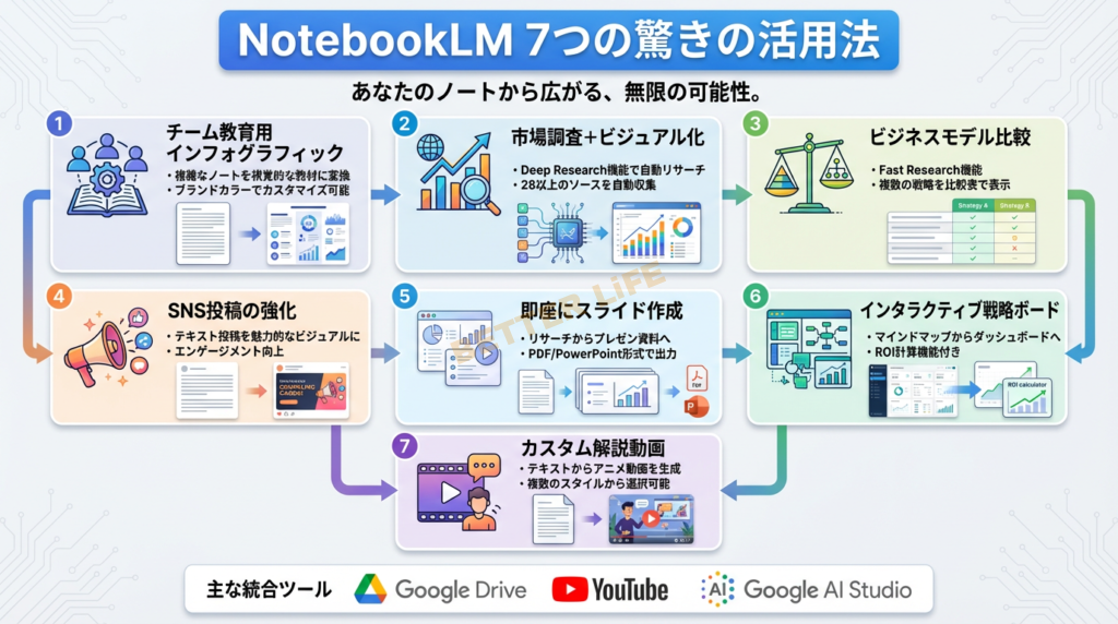 このユースケースの真の価値は、調査とビジュアル化を統合したワークフローにあります。従来は、調査担当者がデータを集め、それを分析チームが解釈し、最後にデザイナーが視覚化するという分断されたプロセスでした。NotebookLMでは、これらすべてが一つのインターフェース内で完結し、しかも高品質な結果が得られるのです。