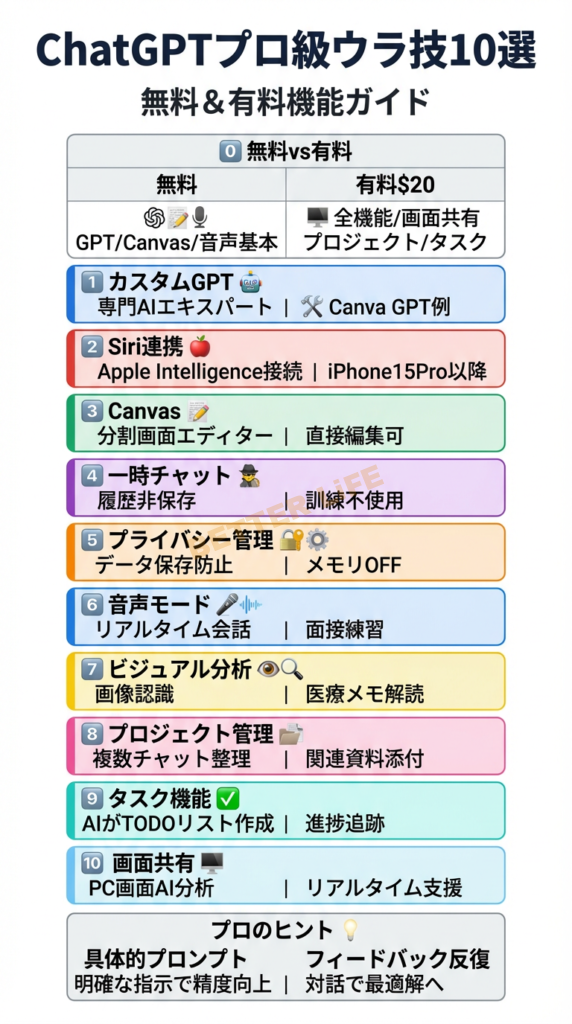 これら9つのウラ技(プラスAppleのボーナス裏ワザ)は、ChatGPTを単なるチャットボットから、包括的な生産性スイートに変えます。カスタムGPTによる専門化、Canvasによる協働的な編集、一時的なチャットによるプライバシー保護、音声モードによる自然な会話、ビジュアル分析による画像理解、画面共有によるリアルタイム認識、プロジェクトによる整理、タスクによる自動化、そしてSiri統合によるシームレスなApple体験。