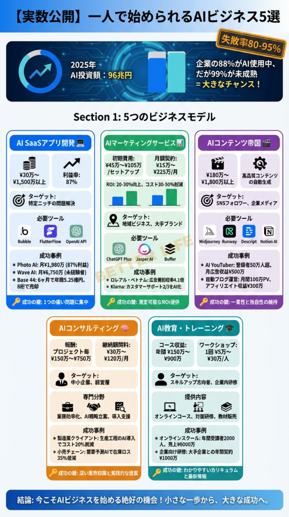本記事では、2025年末時点で実績が証明されており、2026年にさらなる成長が期待できる5つのAIビジネスモデルを詳しく紹介します。それぞれのモデルの収益事例、必要なスキル、具体的な実装方法、そして成功と失敗を分ける要因まで、現実的な視点で徹底解説します。これは「不労所得を得る簡単な方法」ではなく、2026年に真剣にAIビジネスを構築したい人のための実践ガイドです。