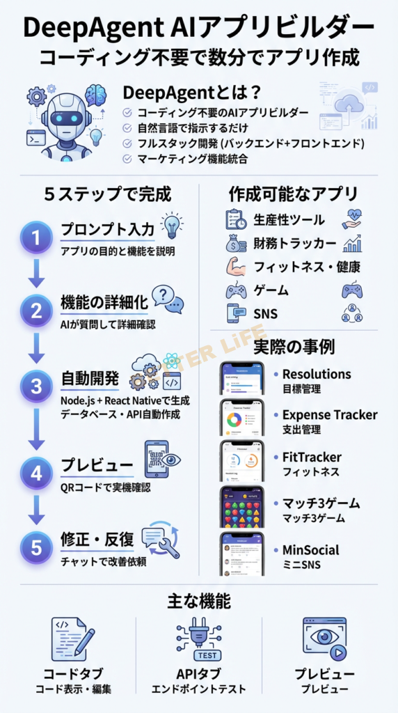 DeepAgentの最も驚くべき点は、その簡単さです。「どんなアプリを作りたいか説明するだけ」でアプリが完成します。複雑なバックエンド(データベース、サーバー、API)からフロントエンド(ユーザーインターフェース、ユーザーエクスペリエンス)まで、すべてが自動生成されます。ユーザー認証、複雑なロジック、マルチスクリーンナビゲーションなど、通常であれば高度な技術を要する機能も、自然言語の説明だけで実装されるのです。