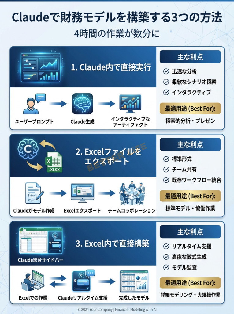 2つ目の方法は、Claude内でモデルを構築し、それをExcelファイルとしてエクスポートすることです。これは、Claudeの速度とExcelの汎用性を組み合わせたアプローチです。