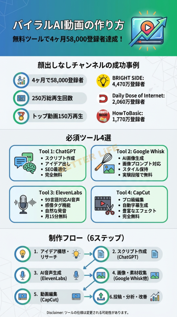 本記事では、ChatGPT、ElevenLabs、Google Whisk、CapCutという4つの無料ツールのみを使用して、バイラルするインスピレーショナル動画を作成する具体的な手法を、ステップバイステップで解説します。これは、副業として、あるいは本格的なビジネスとして、YouTube自動化チャンネルを構築するための実践的なロードマップです。